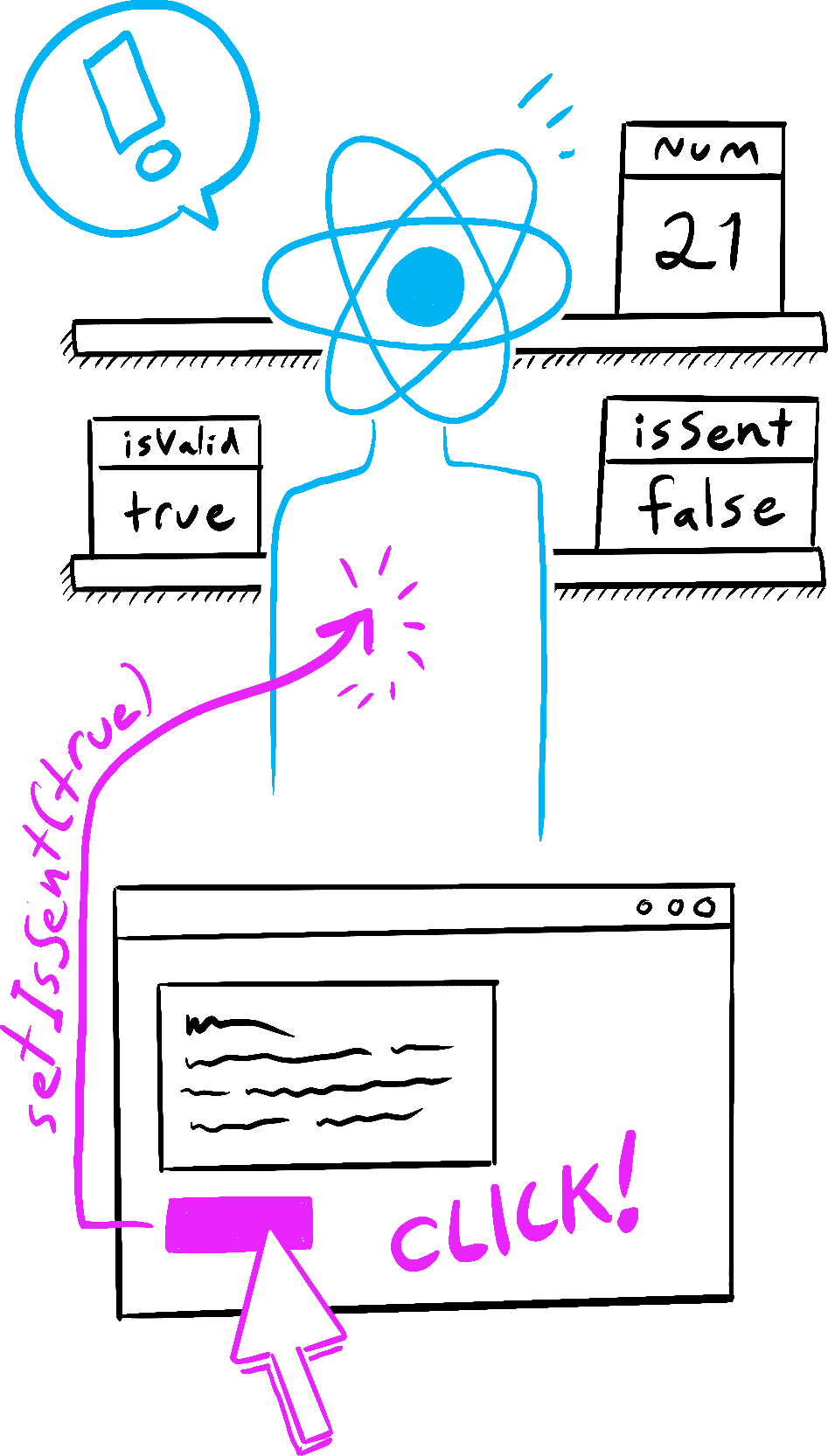 onSubmitest appelé. setIsSent(true)définitisSentàtrueet planifie un nouveau rendu.- React refait le rendu du composant conformément à la nouvelle valeur de